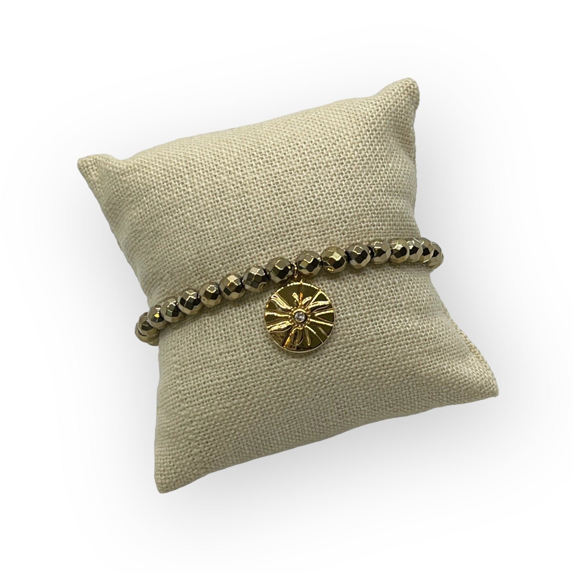 All Pansy Day bracelets are strung on a 7 inch elastic band and feature a signature turquoise bead near the clasp.